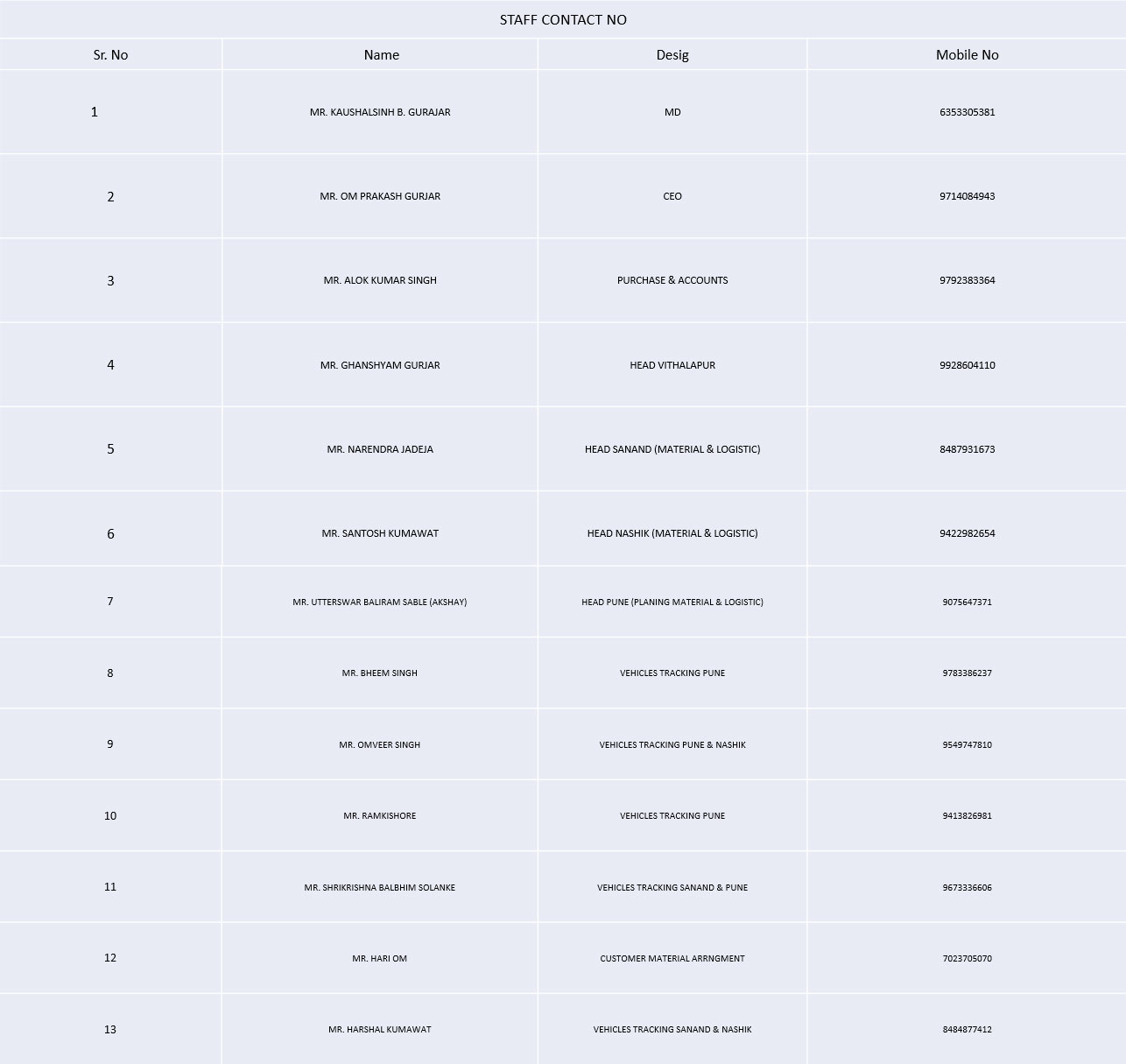 KOMAL ENTERPRISE STAFF CONTACT NO.